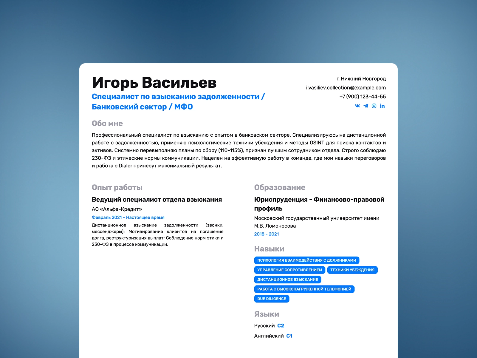 Специалист по взысканию (коллектор) сегодня — это эксперт в области переговоров и права. В 2026 году работодатели в банках, МФО и коллекторских агентствах ищут сотрудников, которые умеют балансировать между эффективностью возврата долгов и строгим соблюдением этических норм и законов. Мы подготовили примеры резюме для стадий досудебного (Soft/Hard) и судебного взыскания, которые подчеркнут вашу профессиональную грамотность и результативность.