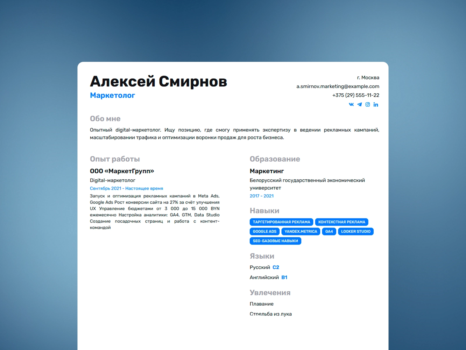 Создайте своё резюме по готовому образцу через наш бесплатный конструктор и выделитесь среди кандидатов на позиции маркетолога, SMM-специалиста или digital-маркетолога.