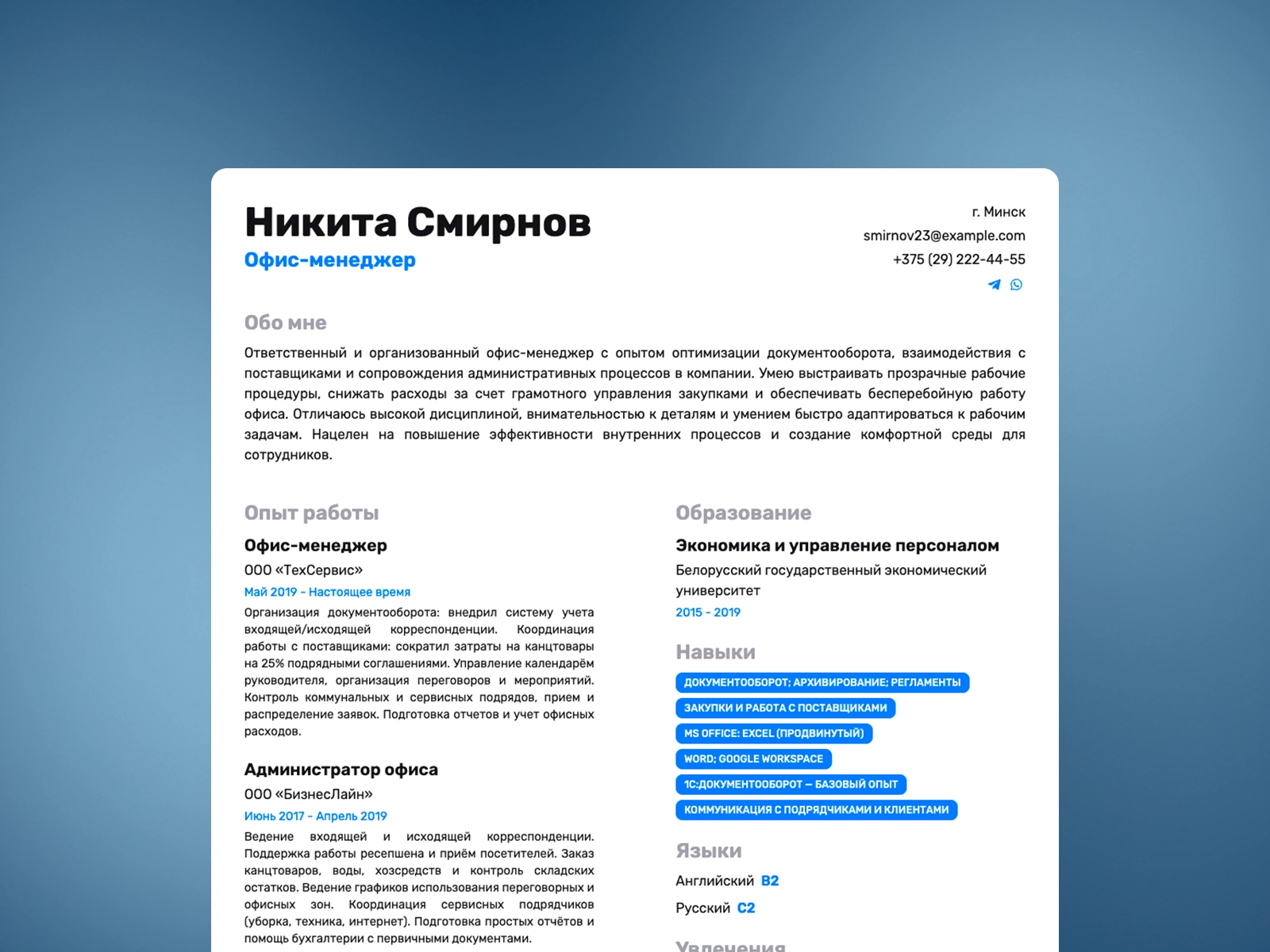 Резюме офис-менеджера — готовый пример и шаблон 2025