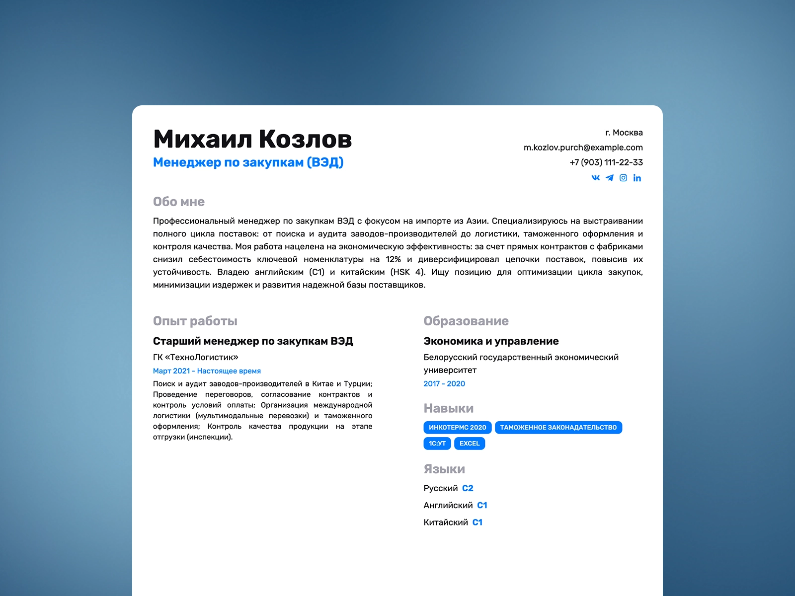 Как составить резюме менеджера по закупкам, чтобы выделиться на фоне конкурентов? В 2026 году компании ищут не просто исполнителей, а стратегов, способных оптимизировать затраты и обеспечивать бесперебойность поставок. Мы подготовили два шаблона: для специалистов по ВЭД (закупки из Китая и Азии) и для менеджеров по снабжению в производственном секторе. Эти примеры помогут вам правильно структурировать опыт работы с поставщиками, логистику и управление складскими запасами.