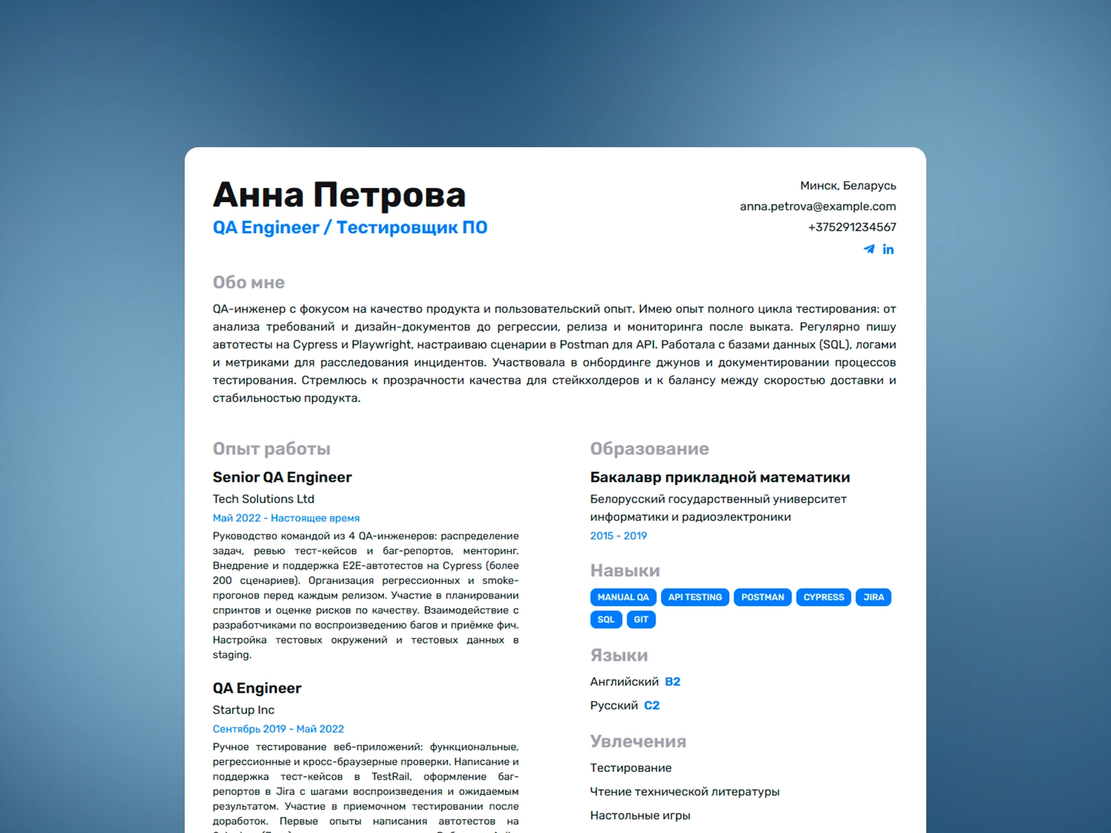 - Пример: «Performance QA с 4 годами опыта. Специализируюсь на поиске узких мест в БД и микросервисах. Отлично владею JMeter, Grafana и анализом логов (ELK)».