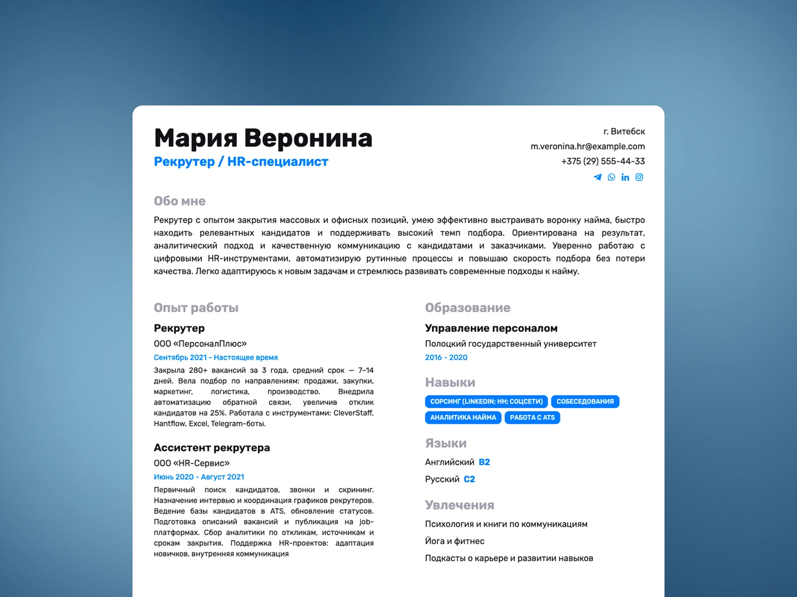 Резюме рекрутера: пример резюме 2025 с готовым шаблоном