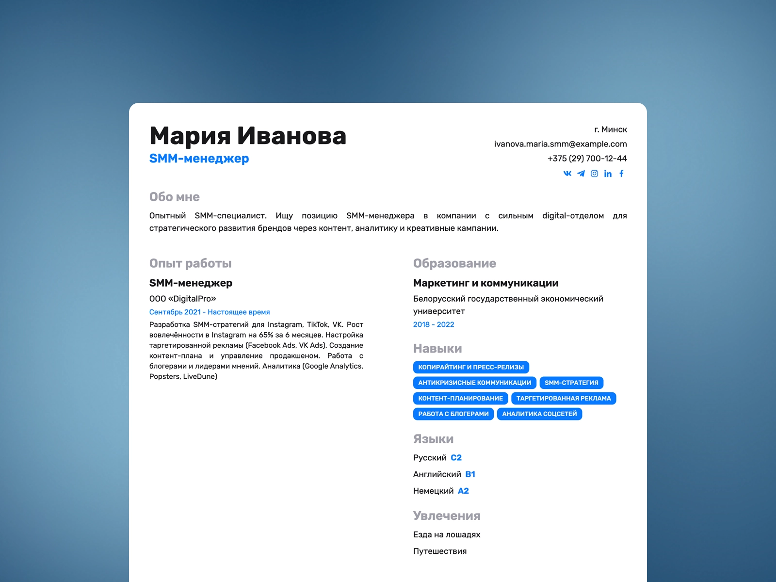 Этот пример резюме SMM-менеджера поможет вам создать профессиональный документ, который оценят digital-специалисты и HR. Будьте конкретны, показывайте цифры, и обязательно добавьте портфолио. Наш конструктор резюме ускорит процесс — создайте структуру, добавьте опыт и скачайте PDF за 5 минут.