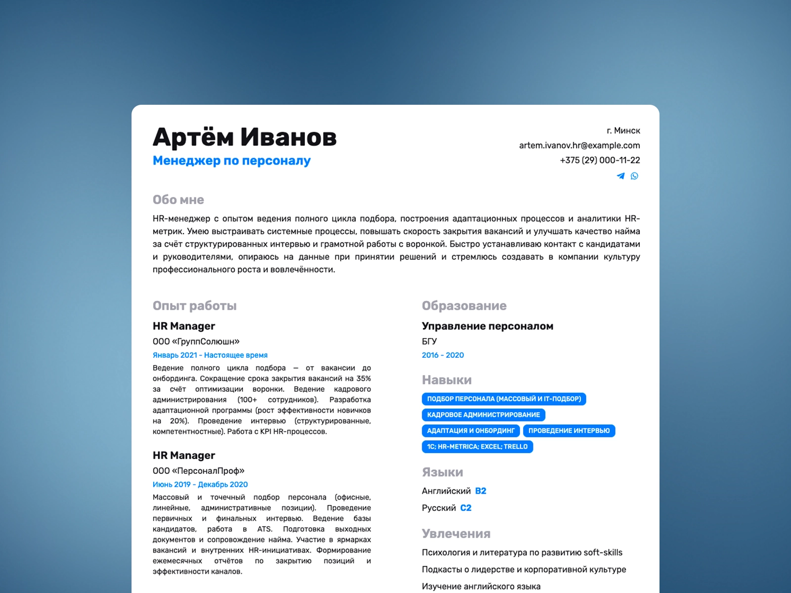 Этот пример резюме менеджера по персоналу поможет вам создать структурированный, понятный и конкурентный документ. Указывайте измеримые результаты, конкретные компетенции и актуальные навыки. А с нашим бесплатным конструктором вы сможете оформить резюме в удобном шаблоне, поделиться ссылкой или скачать PDF всего за 5 минут.