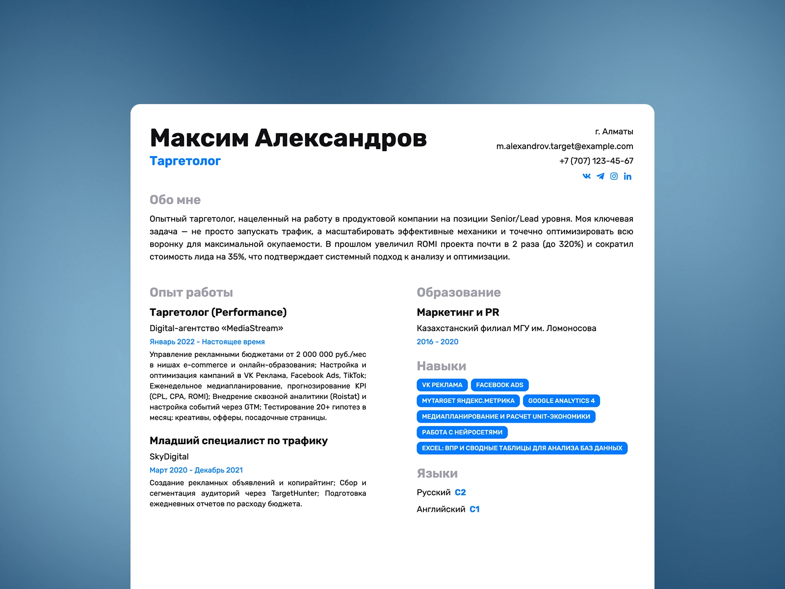 Пример резюме таргетолога — готовый образец 2026 года